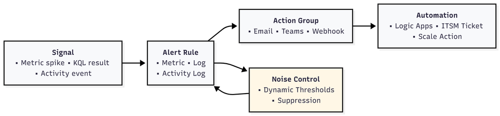 For advanced patterns like dynamic thresholds and suppression, see Advanced Alerting Strategies for Azure Monitoring.