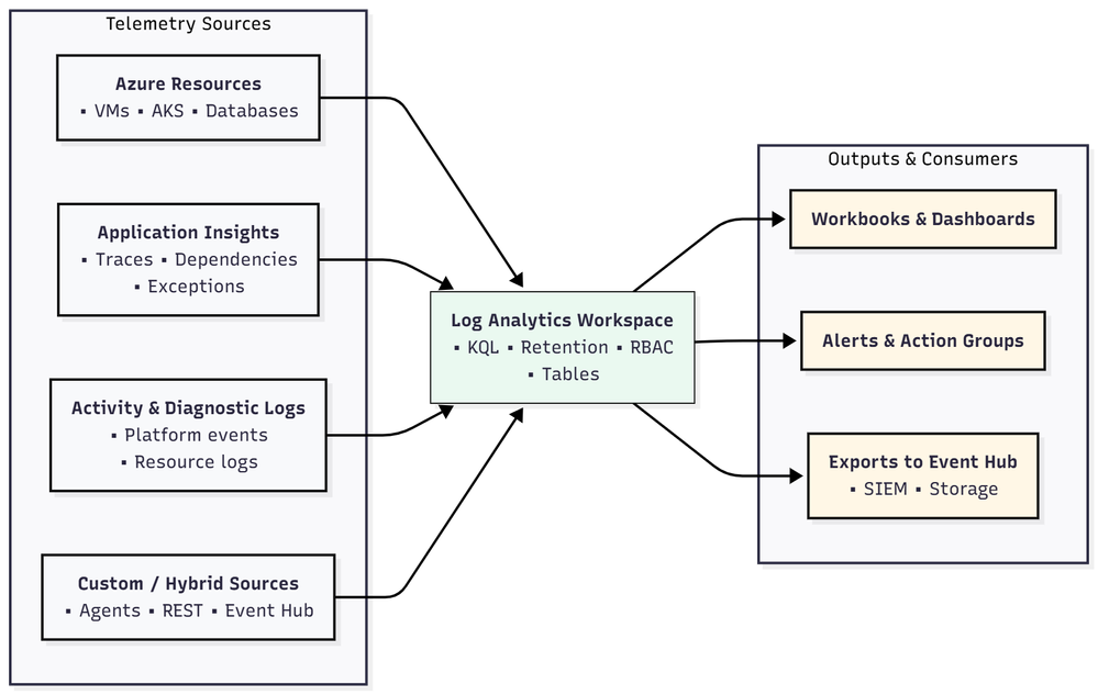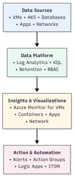 1. Data Sources | Where telemetry originates: VMs, AKS, databases, applications, networks. | Activity Logs, Performance Counters, Container Metrics, App Insights telemetry. |