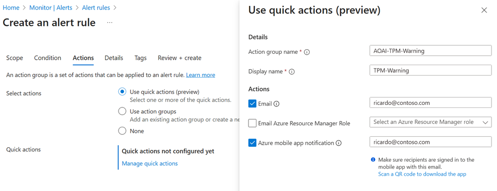 Quick Actions let you add email or mobile notifications without creating a full Action Group.