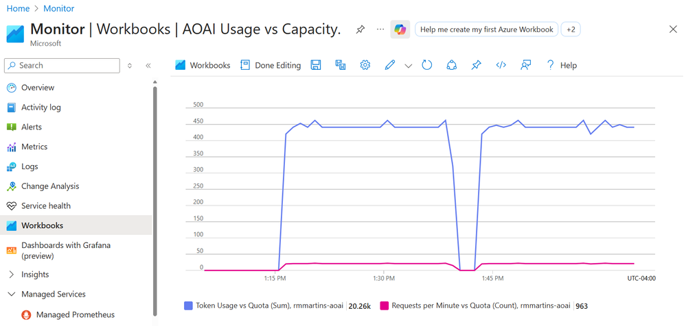 Workbooks let you visualize token and request usage against your deployment’s fixed quotas