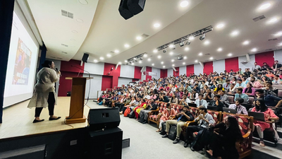 Jasleen giving a presentation on hackathons and SafetyPins to Data Science students at Christ University in India