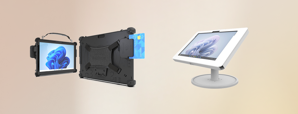 Pictured, left to right: MobileDemand Rugged xCase for Surface Pro with Magtek iDynamo, The Joy Factory Elevate II Countertop Kiosk for Surface Pro (White)Scenario: