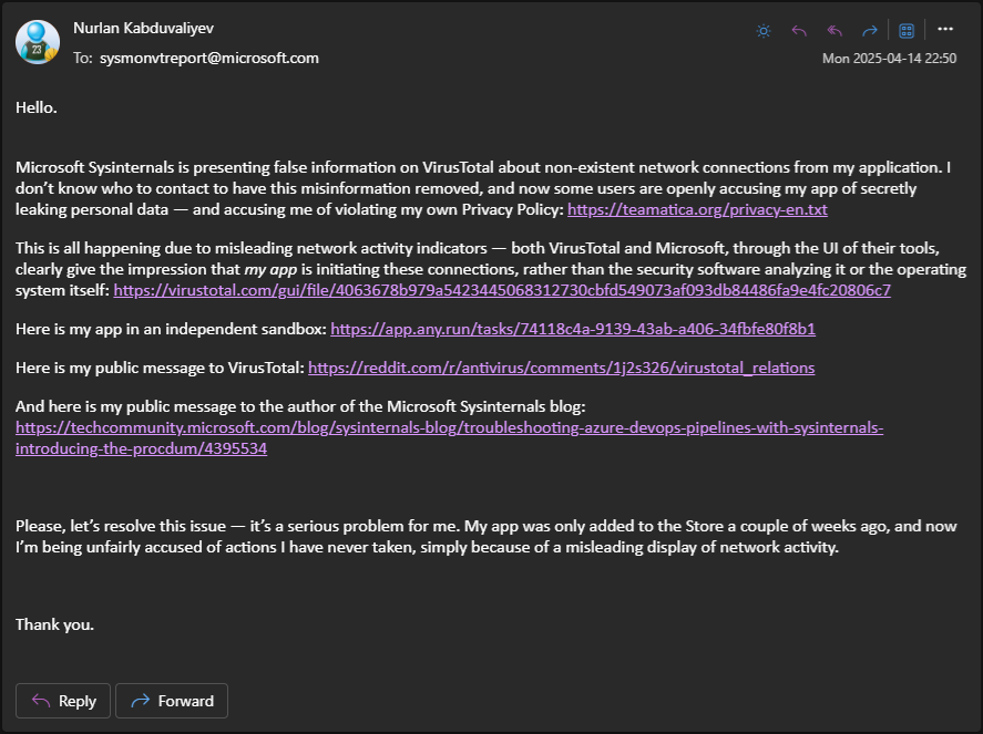 NateL1010Brass ContributorApr 14, 2025I would suggest contacting SysmonVTReport@microsoft[.]com to report issues with the VT Sysinternals integration.