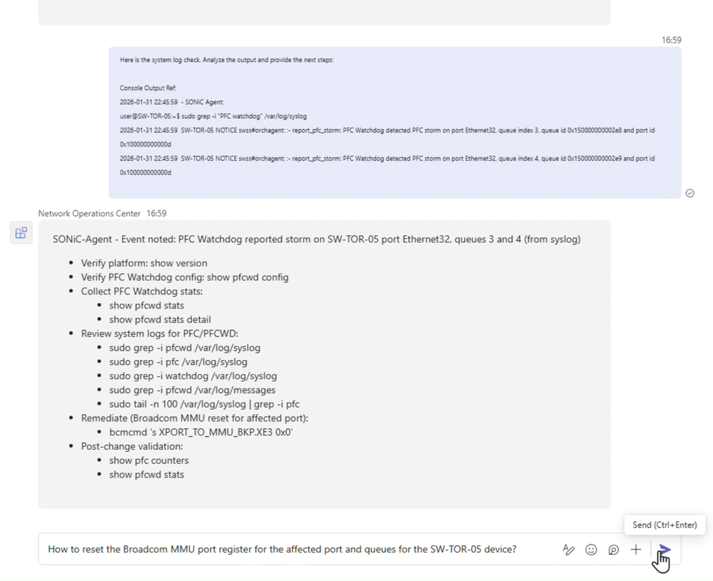 Runs diagnostic playbooks and remediation steps; retrieves insights from Foundry IQ and proposes fixes via the SONiC Agent for device-level commands.