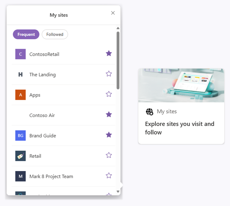 The My sites card provides quick access to frequently visited and followed sites by the user on the Viva Connections Dashboard. Users see personalized results on the sites list, based on their behavior in SharePoint and you can control the list of Followed sites directly from the card.