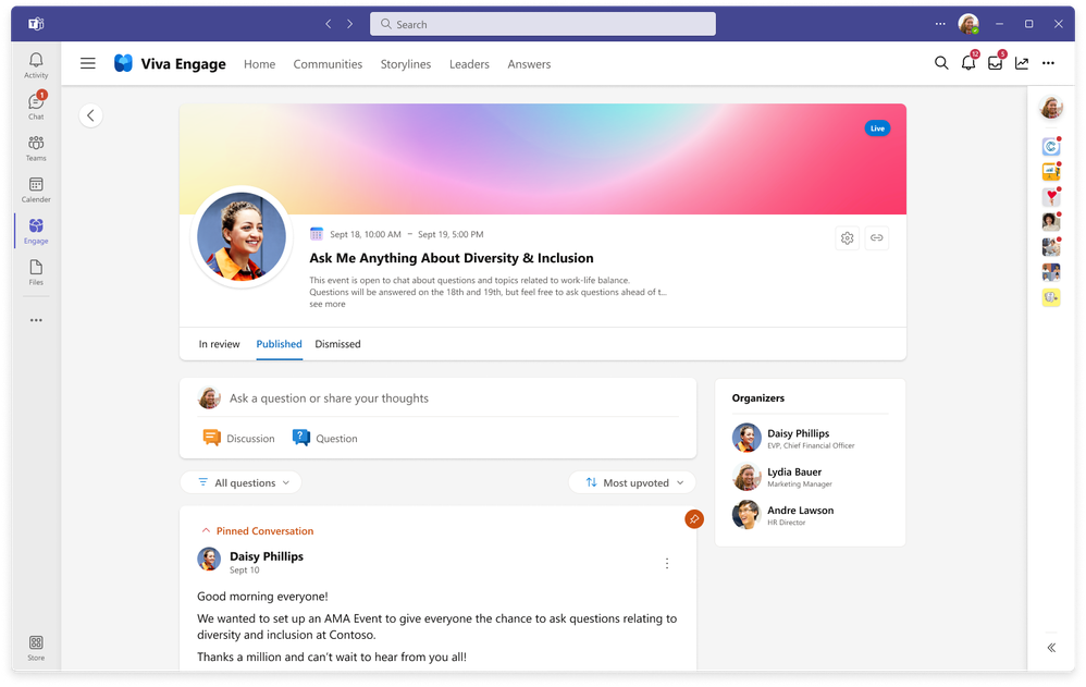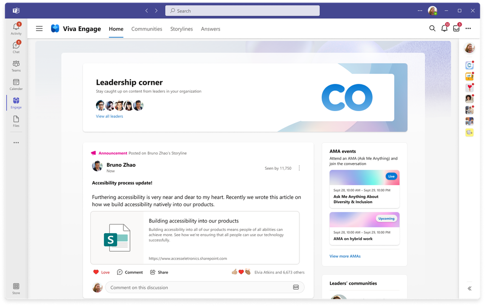Leadership corner brings together leadership experiences across Viva Engage, empowering leaders and employees to connect and engage directly and effectively. Leadership corner is personalized for each employee based on the audiences they belong to and the leaders they choose to follow. Leadership corner aggregates leaders’ posts and announcements across storylines and communities, so employees can catch up with what’s top-of-mind for their leaders. And employees can engage in two-way dialogue with leaders, share questions and ideas in Ask-Me-Anything (AMA) events, and participate in social campaigns to drive business initiatives.