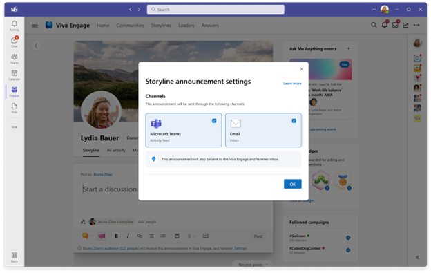 Storyline announcements enable leaders and their delegates to send important updates to their audiences across Outlook, Teams and Viva Engage.