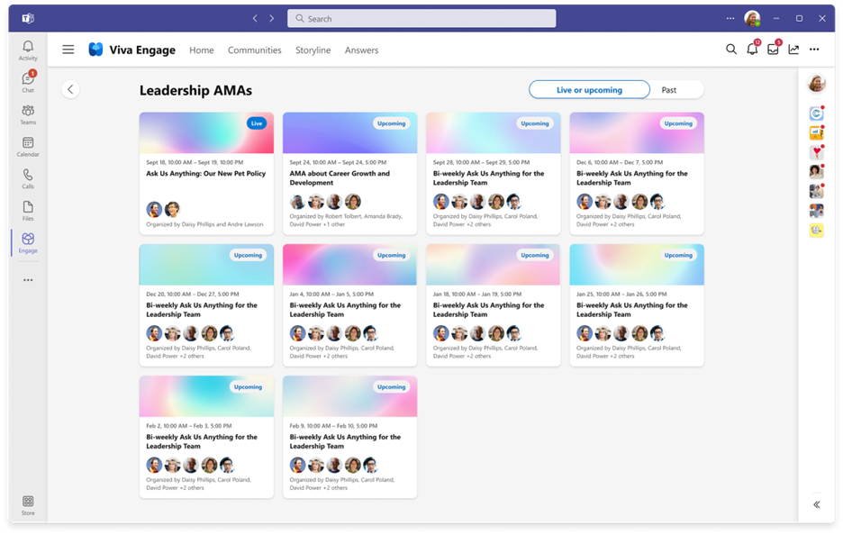 Ask Me Anything events or “AMAs” are a new type of event where employees and leaders can connect to ask and address questions. AMA’s feature moderated questions and answers, enabling a modern take on the live townhall that can span hours or days to be inclusive of employees across time zones. The Q&A centered experience lets employees share questions, concerns and ideas so leaders can hear what really matters. AMA events can drive energy and clarity around a topic, expert, or any business or cultural initiative. Any employee can create an AMA event from their storyline. Events started by leaders and through social campaigns will appear in Leadership Corner.