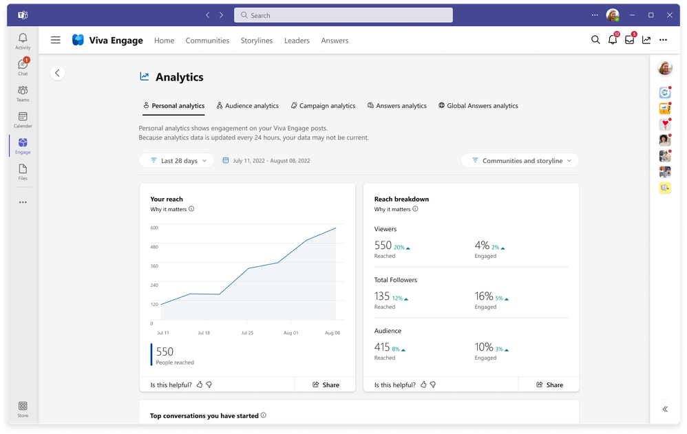 - Audience analytics — Understand Viva Engage adoption across your audience, as well as top conversations and engagement trends. Leaders, delegates, and admin can identify important topics where their engagement is needed, as well as capture employee opinions across important topics.