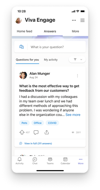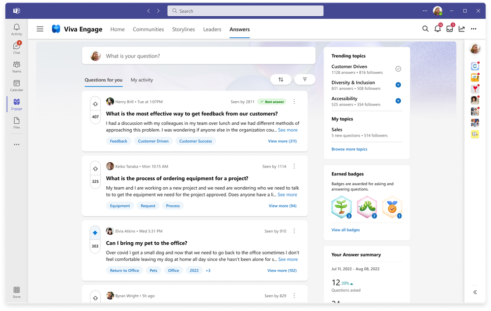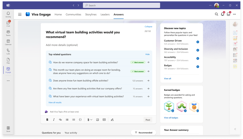 Chasing down the right answers to questions is a challenge in any organization, and has real costs in loss of productivity, redundant work, employee onboarding, and overloading experts. These costs and challenges are exacerbated by hybrid and remote work. Answers in Viva is a new space in Viva Engage that helps people ask questions, find solutions, share what they know, and save everyone time. Powered by Viva Topics, Answers uses AI to help match questions and answers and rewards experts who contribute to its knowledge base, saving time that would otherwise be spent searching for answers or duplicating information. In other words, Answers in Viva puts collective knowledge to work for everyone.