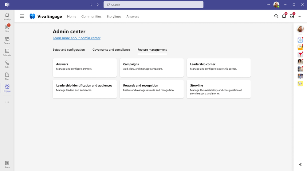 Admins will see a new Viva Engage Admin Center where they will be able to complete tasks such as assigning roles and responsibilities for licensed Viva Suite customers. These tasks include defining leader audiences, designating corporate communicators, appointing admins for Answers in Viva, and additional actions such as: