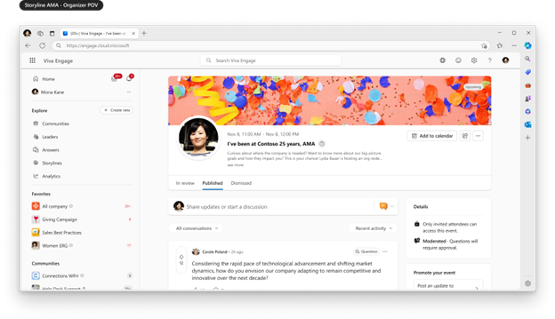 Employees want more direct access to leaders. With Ask Me Anything (AMA) sessions, leaders can host open Q&As on their storyline, where employees can submit questions and comment anonymously, and get real-time responses, all in one familiar place. Organizers can also moderate questions and export them for analysis, making it easier than ever to understand what’s top of mind for employees. It’s a simple, authentic way to build trust and spark dialogue.