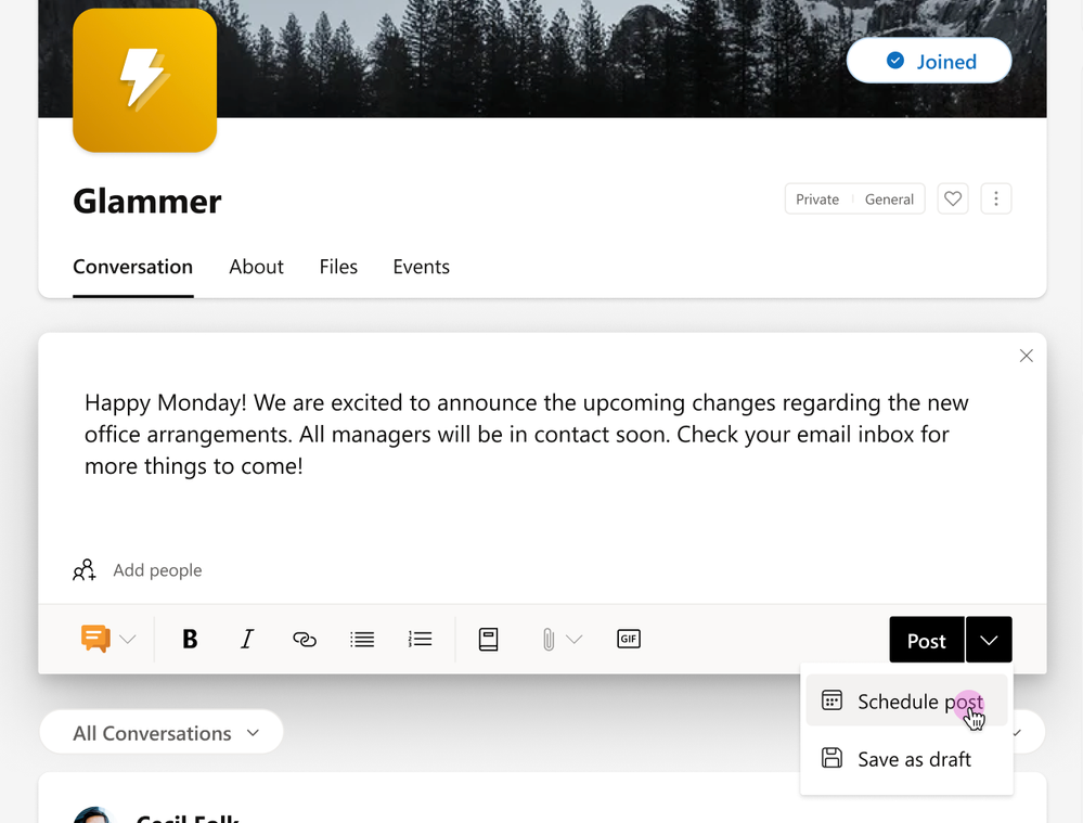 We heard you, timing matters. Employees can now draft and schedule posts in their communities or storyline. Whether you want to plan for a big announcement or simply polish your message before sharing, this feature makes it simple to organize your posts and publish them when the moment is right.