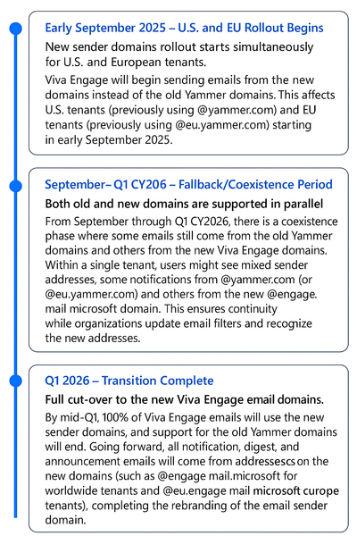 As part of the final phase of the Yammer to Viva Engage rebranding, we are updating the email sender domains used for all Viva Engage communications. This change ensures a consistent and secure brand...