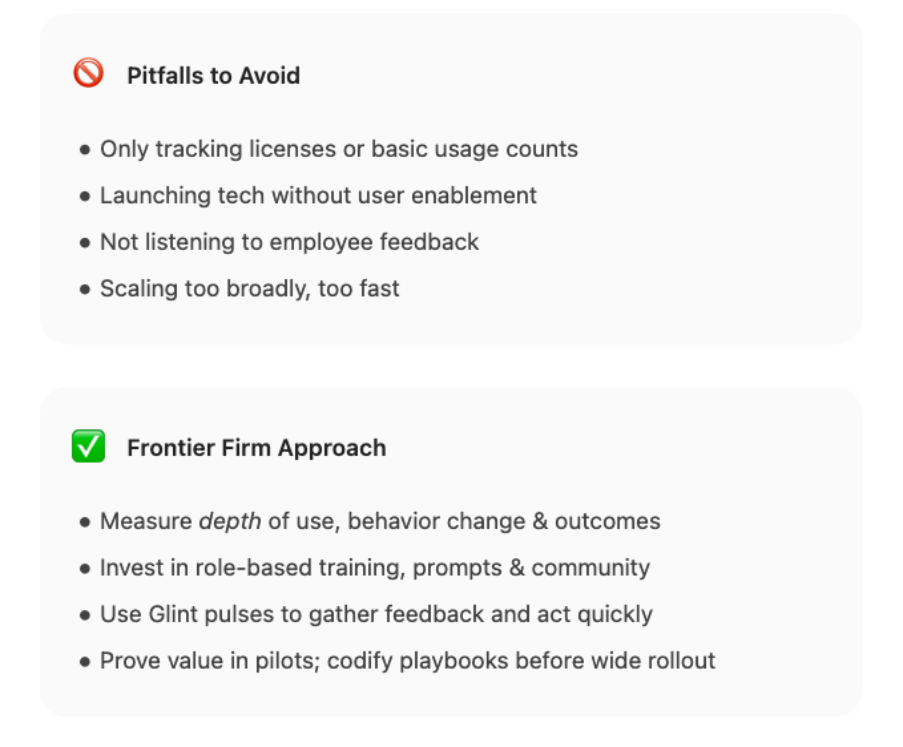 These metrics should be interpreted in combination. For instance, a jump in usage is encouraging – but if experience or trust scores drop, it flags a risk (perhaps people feel pressure to use AI without support). That's why Glint’s qualitative insights are so vital to pair with quantitative metrics. Frontier Firms watch both, ensuring increased AI adoption also means employees feel more effective and empowered, not frustrated or threatened.