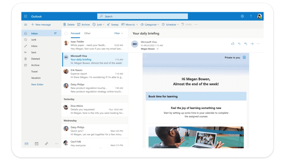 To help streamline work and meet employees where they are, with what they need and when they need it, today we introduced several enhancements in Microsoft Viva, including how we're enhancing the daily briefing email from Microsoft Viva to highlight key information from Viva apps directly in your inbox. Soon, briefing emails will surface personalized employee experience data, including learning reminders, suggested topics, and meeting recaps. And with Viva Insights, you'll also see options to enroll in recurring time booking plans to make it easier to set time aside for catching up on emails and chats, taking regular breaks during the workday, and meeting weekly learning objectives.