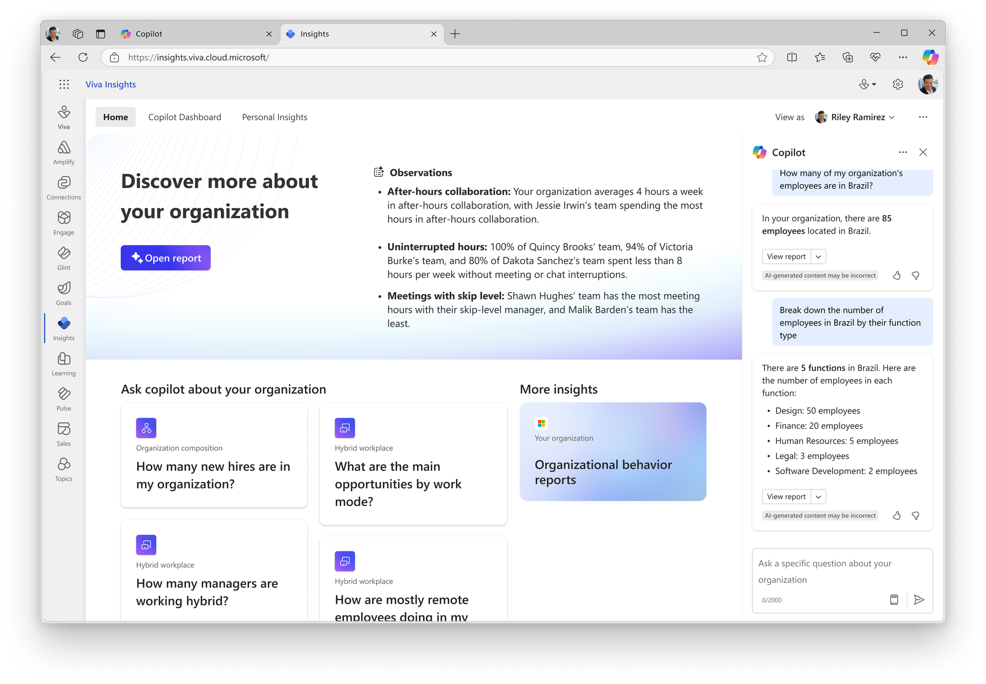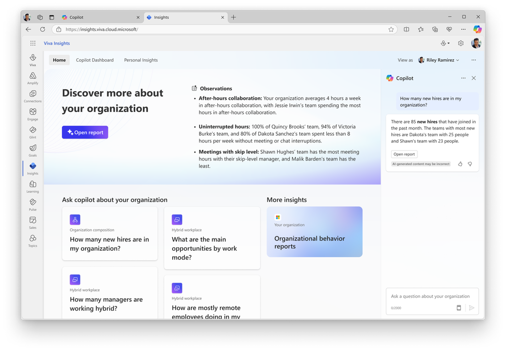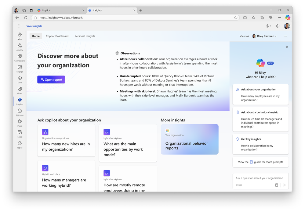 Starting in February 2025, leaders will be able to learn more about their organization using Microsoft 365 Copilot in Viva Insights. Leaders can ask Copilot questions about their organization’s composition and behaviors and can view visualizations of organizational data in the Viva Insights web & Teams app.