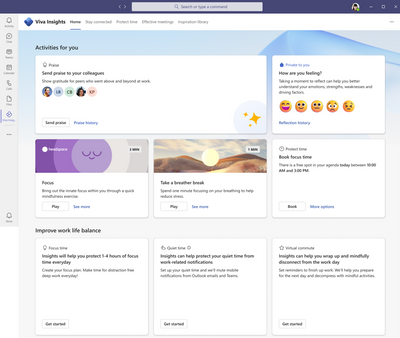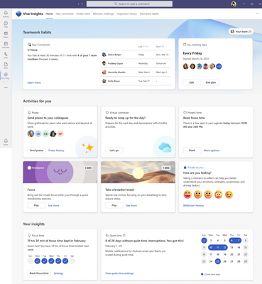The updated Home page will include an invitation to set up a personal focus plan. In the future, it will also include an invitation to set up quiet time to disconnect after-hours with mobile notifications from Teams and Outlook silenced. The Home page will continue to feature personal wellbeing experiences for tapping into moments of gratitude, reflection, and mindfulness and the option to enroll into virtual commute.