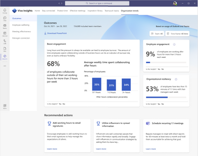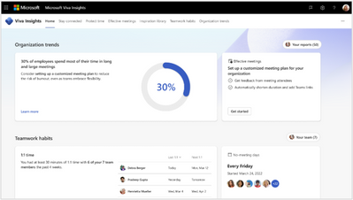 A new section called Organization trends will appear at the top of the Home page for managers and leaders with at least nine individuals in their span of control. The group insights card and a card with recommended actions will be included in this section. The cards will focus on three rotating scenarios: employee wellbeing, meeting effectiveness, and manager connection.