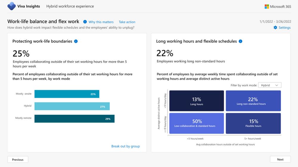 The Hybrid workforce experience report helps leaders make data-driven decisions about hybrid work models and practices that create better and more equitable experiences for all employees, regardless of where and when they work. In addition to actionable recommendations, leaders can track trends and changes over time to help them understand how hybrid work impacts employees in various work modes differently.