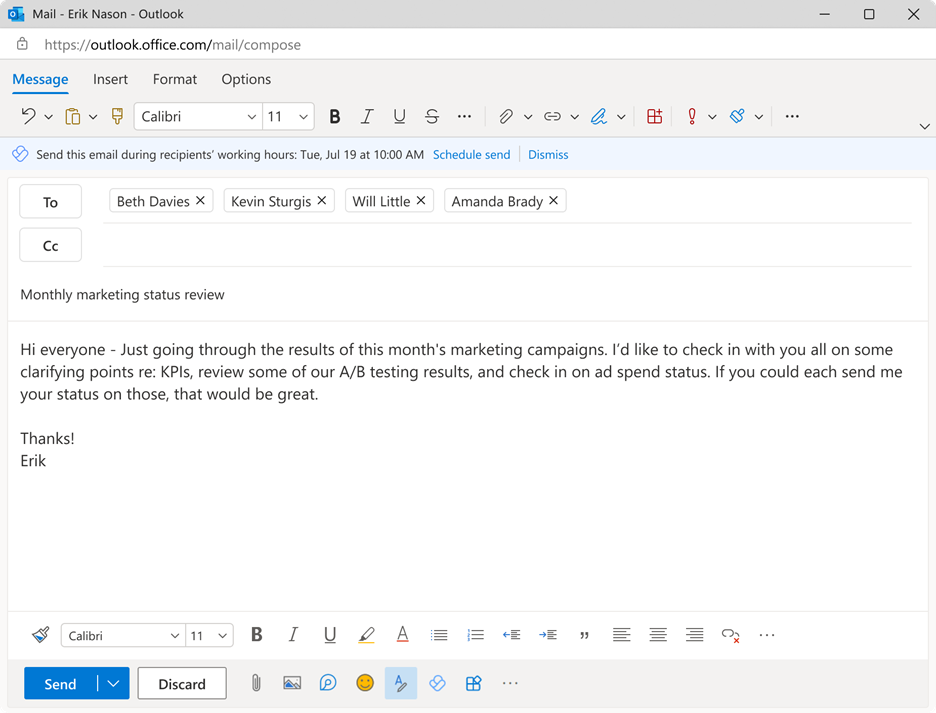 In the coming weeks, Microsoft Viva Insights will begin to display the following inline suggestions, tips, and best practices to users composing an email or a meeting invitation in Outlook on the web. These complement the inline suggestions available while reading emails and meeting invites. Inline suggestions are also available in Outlook for Windows.