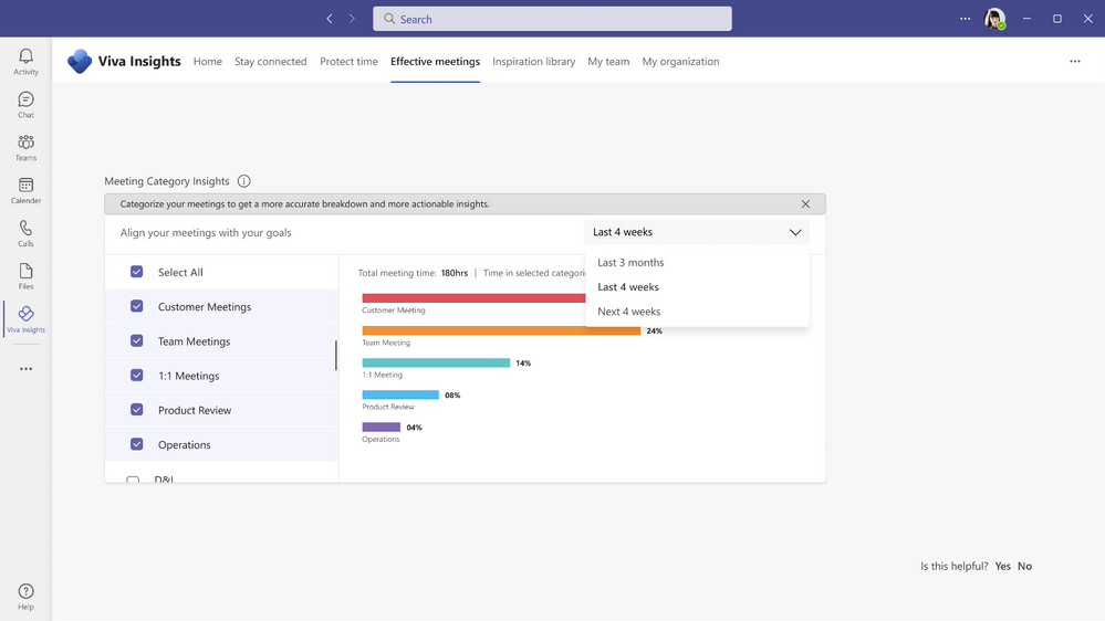 Near the end of August 2022, a new "Effective meetings" tab will be introduced in the Viva Insights app in Teams, giving you visibility into the categories of meetings where you spend your time. Meeting category insights can help you align time spent in meetings with your goals. For example, a leader might find it helpful to reflect on how much time they are carving out for customer meetings, mentoring or coaching, and business reviews. With future updates, you will see more personalized insights and suggestions displayed in this tab that can help improve meeting habits as well as options to create and share meeting plans that can help set team meeting norms.