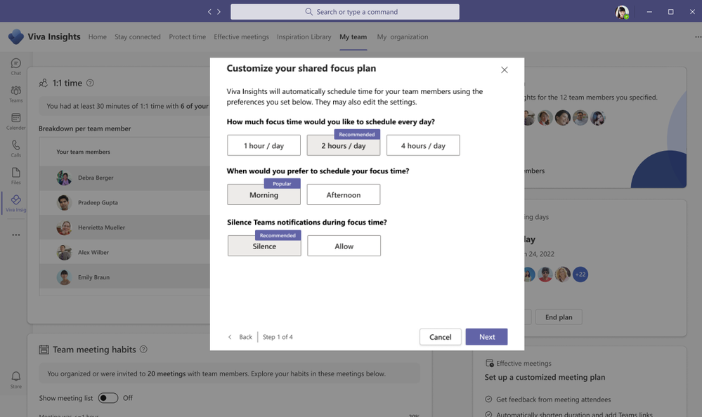 The shared focus plan, available in the Viva Insights app in Teams, allows managers and team leads to invite their teams to automatically book up to four hours of uninterrupted time every day. The shared focus plan helps teams build shared productivity habits with the flexibility to prioritize personal preferences. Viva Insights books focus time two weeks in advance and will not schedule over existing calendar events.