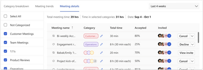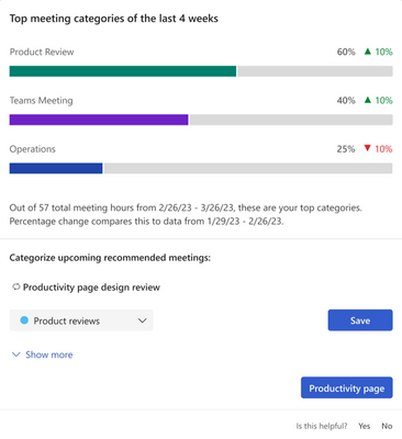 Meeting category insights on the Productivity tab shows you how you’re allocating time across your Outlook meeting categories. We’re updating this feature to help you better align time spent in meetings with your goals.