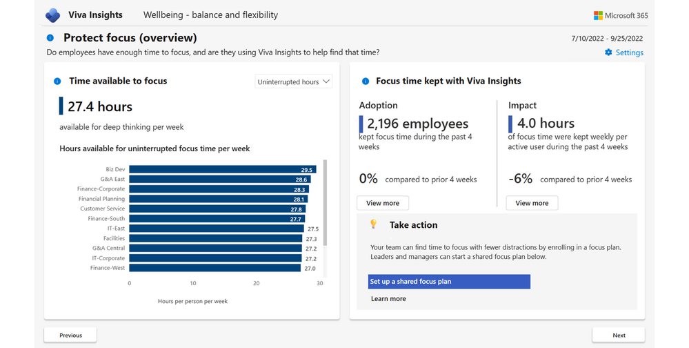 - Protect focus (overview) – Get a baseline view of how much time employees have to focus and how much time they kept as focus time using Viva Insights.
