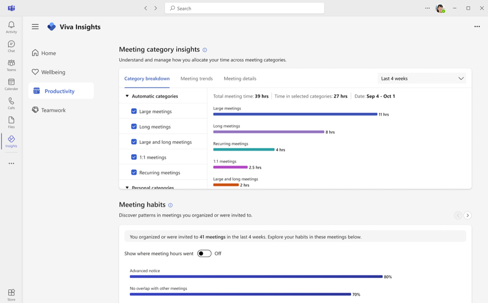 In July, Viva Insights will start to automatically categorize meetings for you. Meeting category insights will begin automatically categorizing meetings for users based on meeting size, length, cadence, and number of people in the meetings. These categories can help licensed users identify meetings that are expensive in terms of time spent, participants included, or both. Using these insights, users can assess whether meetings that fall under this category are a valuable use of time and resources as a step towards doing more with less.