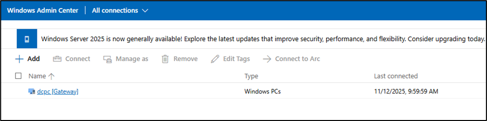 When you installed Windows Admin Center (aMode), you were installing what is known as “the gateway.” When you open your browser to the Windows Admin Center address, a  service called (you guessed it) WindowsAdminCenter starts and presents you with a login screen.