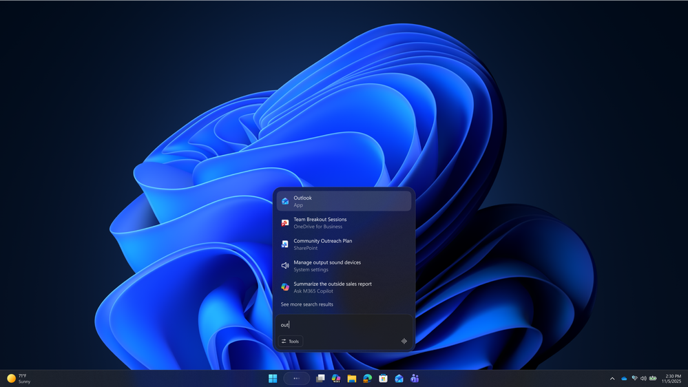 Use search and Ask Microsoft 365 Copilot directly in the taskbar with the new composer experience.