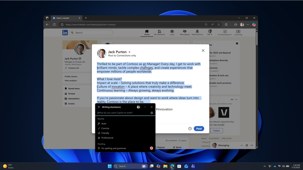 - Write with efficiency, confidence, and clarity. In preview soon, Writing Assistance with Microsoft 365 Copilot helps employees craft compelling content with AI-powered rewrite and proofreading. This is also available offline to Copilot+ PC users, as Writing Assistance leverages the on-device NPU on Copilot+ PCs to run AI models locally, reducing dependency on connectivity.