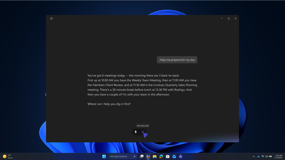 Voice in Microsoft 365 Copilot enables back-and-forth conversation and real-time spoken responses. - When using AI agents that need a longer time to complete their tasks, like Researcher, Agents on the taskbar will show at-a-glance status and chain-of-thought logic, making it easy to check in on the agent’s progress and see its completion status. Coming soon in preview, this unifies how users invoke and manage AI agents across the OS and makes agents seamlessly accessible and interactive.