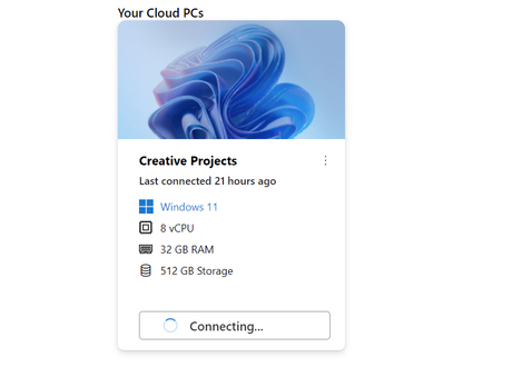 After going through the introduction experience, the employee will land in the Windows 365 app experience that lists all their Cloud PCs. Note: We support both Windows 365 and Microsoft Dev Box as part of the “Your Cloud PCs” list of Cloud PCs.