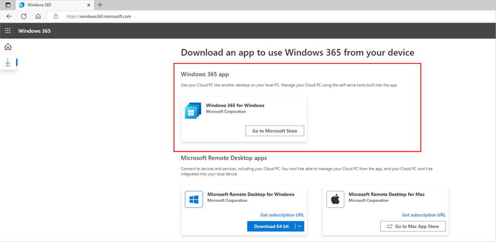 The Windows 365 app is available via the Microsoft Store on Windows. The Microsoft Store will ensure that the Windows 365 app remains up to date, eliminating the need for the IT admin to maintaining the application. To get the Windows 365 app: