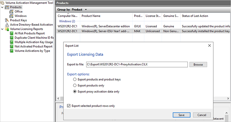 - On the VAMT offline host, export VAMT data with installation IDs to a .cilx file. Then copy this .cilx file to the VAMT online host. Select the individual product (client computer) that received Server-ESU-Year1 key in the previous step. In the Actions pane on the right, select Export list. Select Export proxy activation data only under Export options. Check Export selected product rows only option and save it to a file. Copy this .cilx file to some removable media. Note: For information on what’s in the exported file, see Import and export VAMT data.