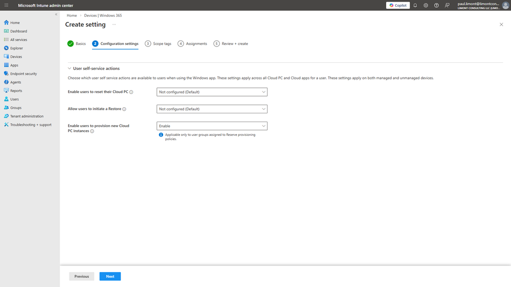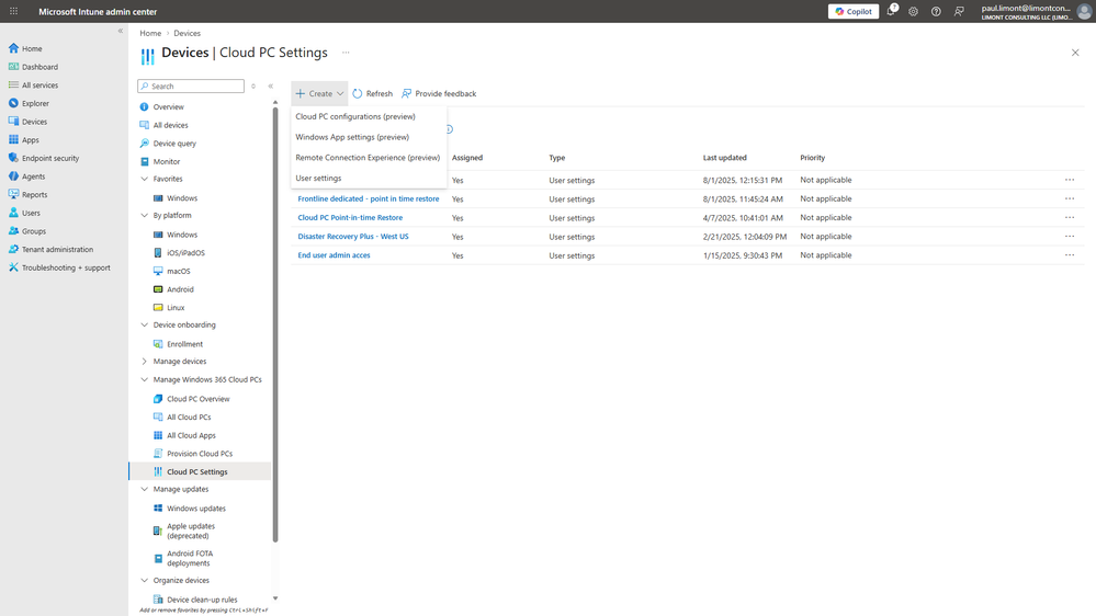 - In Intune, go to Devices > Windows 365 > Settings