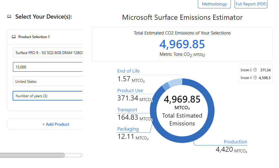 The Microsoft Surface Emissions Estimator, now available on the web, and the Surface Management Portal in Intune offer more insights on Surface device fleets, including estimated carbon emissions resulting from manufacturing and usage.viii This model-level transparency allows procurement and sustainability teams to make informed decisions, track progress toward emissions goals, and align IT investments with corporate ESG commitments.