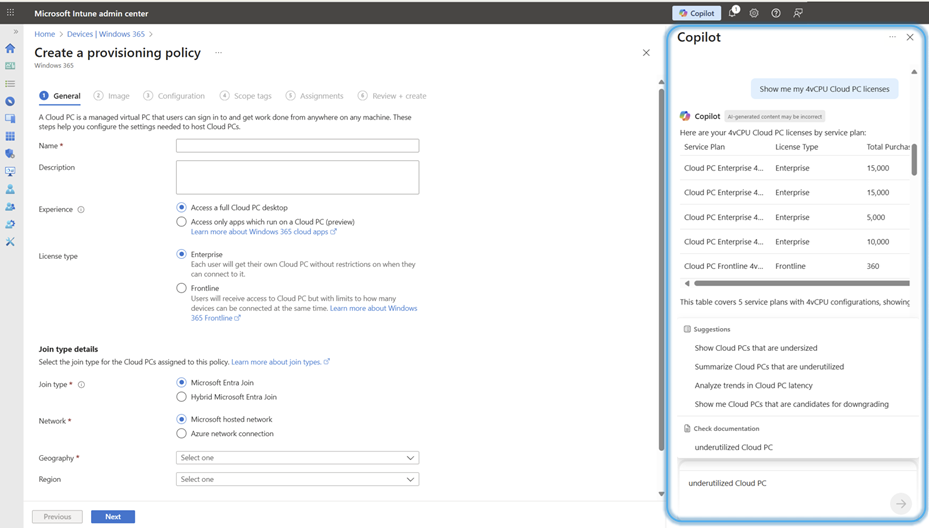 - Finally, with the recent Windows 365 integration with Copilot in Intune, IT admins gain insights into Cloud PC connectivity trends, performance issues, and deployment gaps.
