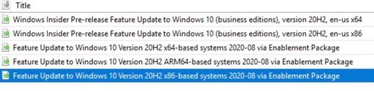 If you are managing updates with WSUS, you will have the option of taking a full feature update to 20H2 or testing out the enablement package path. As with any other validation done on pre-release updates published to WSUS, you will need to first ensure that you have synced the “Windows Insider Preview” category. Once you have synced this category, you should see the following updates show up in your console as shown below: