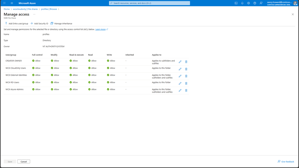 In the screenshot above, you can see the Manage access page, where each row is an individual permission added to the SMB file share. In this example, WCX-External-Identities is the Entra group containing the external identities, and they have been assigned permissions in the file share which will be used to create and access each external identity user’s FSLogix profile container. - Configure FSLogix in your session hosts to use this Azure File share.