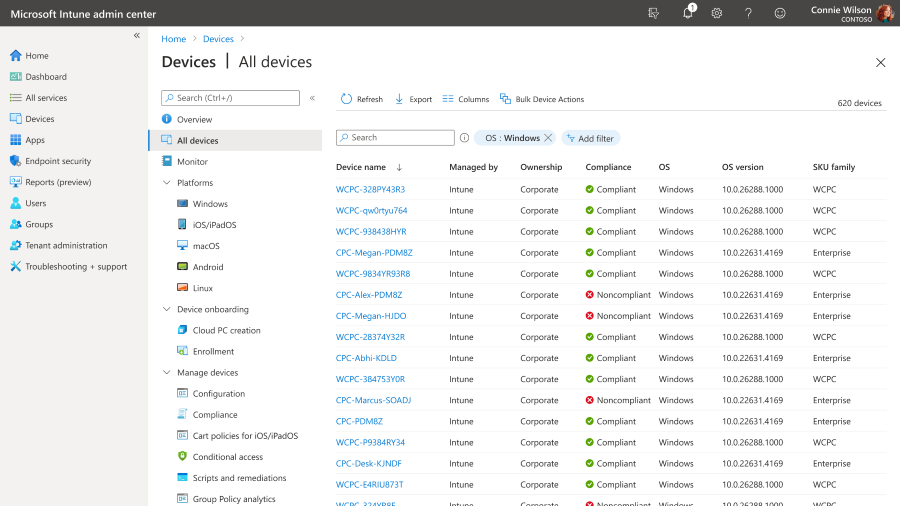 Windows devices list in Microsoft Intune admin center showing Windows 365 Link and Cloud PCs