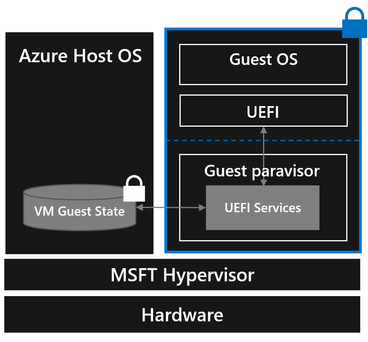 In the same way, a guest VM traditionally relies on the host OS to implement authenticated UEFI variables to ensure that secure UEFI variables are isolated from the guest OS and cannot be modified without detection. To provide a Confidential VM authenticated UEFI variables that are secure from the host as well as the guest OS, the guest paravisor (running in the guest VM but isolated from the guest OS), manages authenticated UEFI variables. When a Confidential VM uses UEFI runtime services to write a variable, the guest paravisor processes the authenticated variable rights and persists that data in the VM Guest State file. Our design allows a Confidential VM to persistently store and access VM guest state and guest secrets (e.g., UEFI state and vTPM state) that are secure from the host as well as the guest OS.