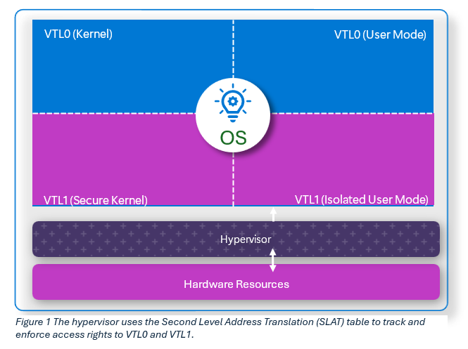 Some background: Virtualization Based Security (VBS) is the core feature of Windows used to the high value secrets stored within Windows (e.g., Credential Guard). VBS utilizes the Hyper-V hypervisor to create an environment that is higher privileged than the rest of the system kernel. Like VM isolation, the hypervisor sets memory protections in the second level address tables and IOMMU tables to isolate this environment from the rest of the system kernel. The secure kernel (part of VBS) can also provide memory integrity protection to the system kernel, ensuring the system loads only signed drivers that are not tampered with.