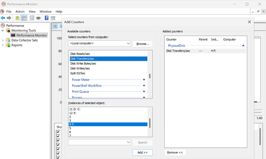 Screenshot of Performance Monitor, showing how to add a counter for Disk Transfers/sec to measure IOPS of an NVMe drive.Screenshot of higher IOPS when running Native NVMe stack on Windows Server 2025.