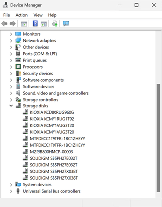 Alternatively, use this Group Policy MSI to add the policy that controls the feature then run the local Group Policy Editor to enable the policy (found under Local Computer Policy > Computer Configuration > Administrative Templates > KB5066835 251014_21251 Feature Preview > Windows 11, version 24H2, 25H2). Once Native NVMe is enabled, open Device Manager and ensure that all attached NVMe devices are displayed under the “Storage disks” section. Screenshot of Device Manager where NVMe devices show up under the Storage disks section.