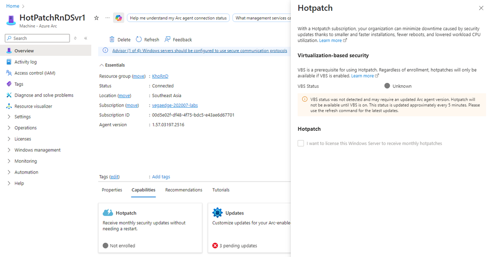 Thanks to Azure Arc, enabling hotpatches for your Windows Server 2025 Datacenter and Standard edition evaluation machines takes only a few clicks. Simply enroll through the built in Azure Arc agent setup included in Windows Server 2025 evaluation, enable the hotpatch preview, and you’re in business.