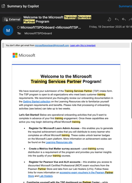 Does the Partnering Centre show the TSP status of a company once it has registered, and is there a way to verify this? Having received the confirmation email below and acted accordingly, can I begin delivering courses using an MCT with the appropriate competencies? This also leads to another question: is the first year of TSP admission primarily intended to build up the required metrics in the dashboard? Still albeit confused, even after going through a similar question in some other thread and onboarding information provided in the email below. Every pointer is much needed and appreciated please. Take note of below I have received the welcome email and acted accordingly: Welcome to the Microsoft Training Services Partner Program! Went through and created below where needed Register for Microsoft Learn Admin Access – Create a Metrics that Matter survey account – Register for Pearson Vue and ALH accounts –(still having issues creating one) Familiarize yourself with the TSP dashboard on Partner Centre Kind Regards Solomon UwagboleIdentity Verification Rejected in Partner Center – What Are the Next Steps?
