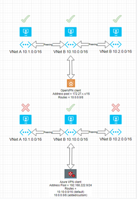 Hello, I’ve set up a storage account in Tenant A, located in the AUEast region, with public access. I also created a VM in Tenant B, in the same region (AUEast). I’m able to use IP whitelisting on the storage account in Tenant A to allow traffic only from the VM in Tenant B. However, in the App Insights logs, the traffic appears as 10.X.X.X, likely because the VM is in the same region. I'm unsure why the public IP isn't reflected in the logs. Moreover, I am not sure about this part https://learn.microsoft.com/en-us/azure/storage/common/storage-network-security-limitations#:~:text=You%20can%27t%20use%20IP%20network%20rules%20to%20restrict%20access%20to%20clients%20in%20the%20same%20Azure%20region%20as%20the%20storage%20account.%20IP%20network%20rules%20have%20no%20effect%20on%20requests%20that%20originate%20from%20the%20same%20Azure%20region%20as%20the%20storage%20account.%20Use%20Virtual%20network%20rules%20to%20allow%20same%2Dregion%20requests. This seems contradictory, as IP whitelisting is working on the storage account. I assume the explanation above applies only when the client is hosted in the same tenant and region as the storage account, and not when the client is in a different tenant, even if it's in the same region. I’d appreciate it if someone could shed some light on this. Thanks, Mohsen34Views0likes3CommentsAzure VPN client vs OpenVPN network peering transit behaviour